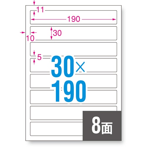 商品仕様 | ●サイズ/A4 ●ラベルサイズ/30×190mm ●面付け/8面 ●カット内容/角丸 ●紙質/上質紙 ●総厚み/0.13mm ●白色度/81% ●その他仕様/●手書き対応 ●備考/※コピー、レーザーは厚紙モード・手差し給紙でお使いください。機種によっては対応しない場合がございます。 ※インクジェットはにじみが生じる場合がございます。 |