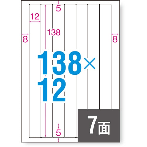 商品仕様 | ●サイズ/はがき ●ラベルサイズ/12×138mm ●面付け/7面 ●紙質/上質紙 ●総厚み/0.13mm ●白色度/約90% ●その他仕様/●フラットファイル用 ●備考/※用紙厚さ138g/m2以上に対応する機種でお使いください。 |
