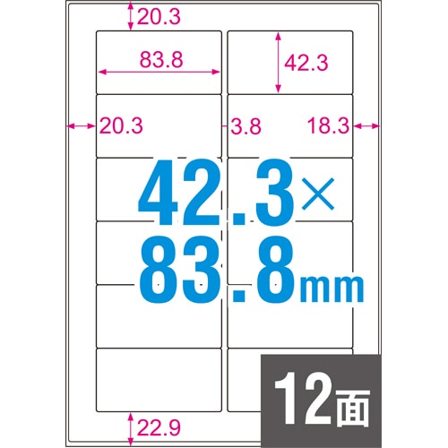 商品仕様 | ●サイズ/A4 ●ラベルサイズ/42.3×83.8mm ●面付け/12面 ●紙質/撥水マット紙 ●ラベルの厚み/0.1mm ●総厚み/0.2mm ●水に強い/○ ●備考/※貼付けは常温下で行ってください。 ※インクジェットは顔料のみです。 |