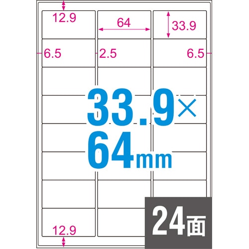 商品仕様 | ●サイズ/A4 ●ラベルサイズ/33.9×64mm ●面付け/24面 ●カット内容/余白あり ●紙質/撥水マット紙 ●ラベルの厚み/0.1mm ●総厚み/0.2mm ●水に強い/○ ●備考/※貼付けは常温下で行ってください。 ※インクジェットは顔料のみです。 |