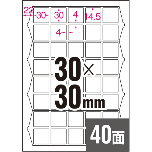 商品仕様 | ●サイズ/A4 ●ラベルサイズ/30×30mm ●面付け/40面 ●カット内容/四辺余白付(角丸) ●紙質/上質紙 ●総厚み/0.13mm ●白色度/81% ●その他仕様/●手書き対応 ●備考/※コピー、レーザーは厚紙モード・手差し給紙でお使いください。機種によっては対応しない場合がございます。 ※インクジェットはにじみが生じる場合がございます。 |