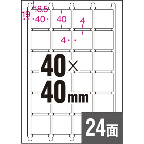 商品仕様 | ●サイズ/A4 ●ラベルサイズ/40×40mm ●面付け/24面 ●カット内容/四辺余白付(角丸) ●紙質/上質紙 ●総厚み/0.19mm ●白色度/98% ●その他仕様/●ハイグレード ●手書き対応 ●備考/※コピー、レーザーは厚紙モード・手差し給紙でお使いください。機種によっては対応しない場合がございます。 ※インクジェットはにじみが生じる場合がございます。 |