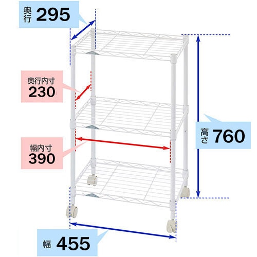●幅455mm、高さ760mmのホワイトの3段カラーラック