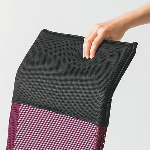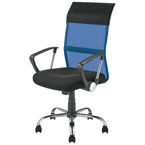 ●背もたれ上部はクッション内蔵で首アタリがやわらかいブルーのメッシュチェア。