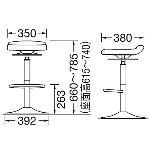 | 商品仕様 | ●座面張地タイプ/合成皮革 ●寸法/W392×D392×H660~785mm ●重量/7.5kg ●色/脚:ブラック、座:ブラック ●座面高さ/615~740mm ●材質/張り材:PVC、芯材:合板、ベース・ステップ:スチール ●肘掛け/なし ●製造国/台湾 ●保証期間/外装・表面仕上げ:1年、機構部・可動部:2年、構造体:3年 ●その他仕様/●座面寸法:幅350×奥行380mm ●ベース寸法:φ392mm |