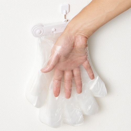 ●付属のクリップで吊るせば、片手装着がしやすくなる。本体100枚入です。