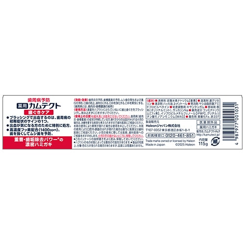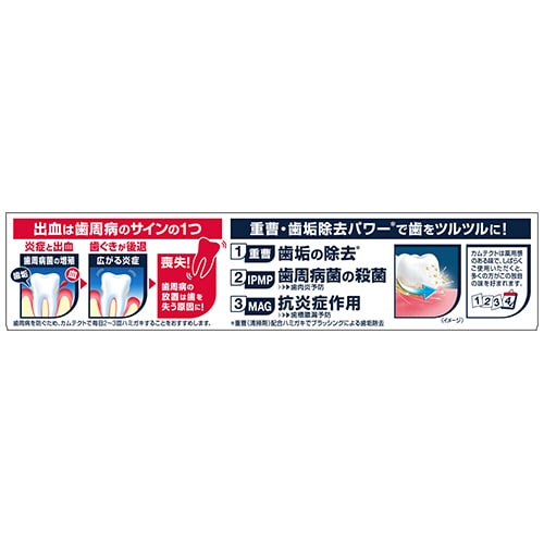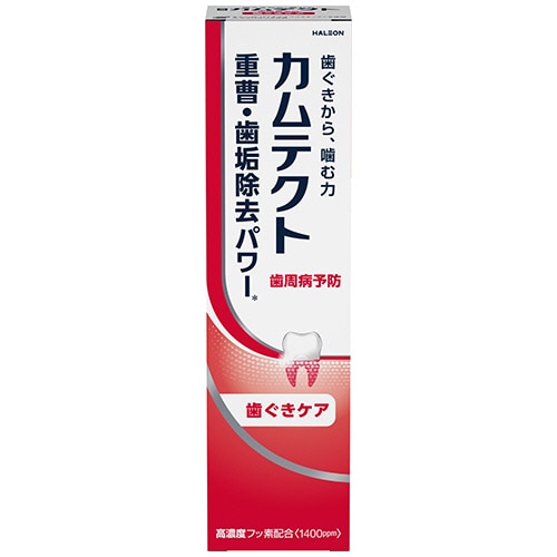 | 商品仕様 | ●内容量/115g ●香味/オリジナルミント ●成分/清掃剤:炭酸水素ナトリウム(重曹)、湿潤剤:濃グリセリン、清涼剤:ハッカ油・L-メントール、発泡剤:ヤシ油脂肪酸アミドプロピルベタイン、粘度調整剤:キサンタンガム、香味剤:香料(オリジナルミント)・サッカリンNa、薬用成分:フッ化ナトリウム(フッ素)・イソプロピルメチルフェノール(IPMP)・グリチルリチン酸モノアンモニウム(MAG)、着色剤:黄酸化Fe・赤227 ●その他仕様/●効能・効果:歯肉炎の予防、歯槽膿漏の予防、ムシ歯の発生および進行の予防、口臭の防止、歯を白くする、口中を浄化する、口中を爽快にする ●生産国:日本 ●備考/※6歳未満には使用させないでください。 ※販売名:カムテクトAcf ●シリーズ名/カムテクト |