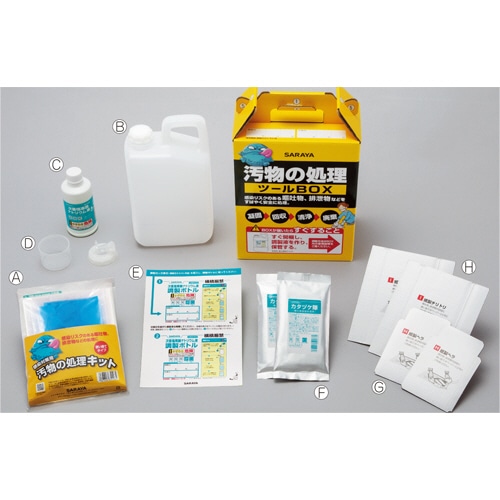 商品仕様 | ●その他仕様/●仕様:汚物の処理ツールBOX ●セット内容:調整ボトル(空)1本、次亜塩素酸ナトリウム液5~6%250ml×1本、カップ&ノズル各1個、調整ボトル用シール1シート(ラベル2枚分)、「汚物の処理キット」1セット、嘔吐物凝固処理剤「カタヅケ隊」25g×2袋、紙製ヘラ2枚、紙製チリトリ2枚 ●備考/※緊急時にすぐ対応できるよう、BOXが届いたらすぐに、次亜塩素酸ナトリウム液を調整し、取っ手を組み立てて冷暗所に保管しておきましょう。 |