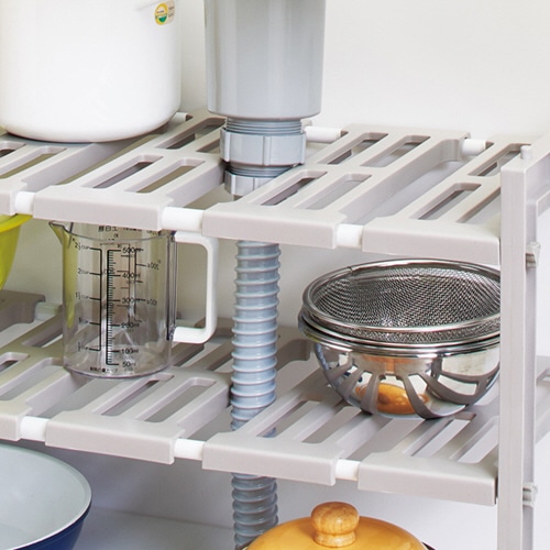 ●12枚ある棚板はすべて自由に取り外し・組み替えが可能なので、シンク下の邪魔な排水管を避けてラックを設置できる伸縮式ラックです。