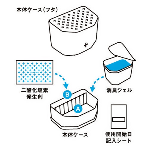 | 商品仕様 | ●成分/二酸化塩素発生剤(亜塩素酸ナトリウム・焼成ゼオライト) ●その他仕様/●仕様:無香料 ●セット内容:本体ケース、二酸化塩素発生剤20g、消臭ジェル120g、使用開始日記入シート ●使用目安:約3ヵ月持続 ●適用床面積:6~10畳 ●備考/※ご使用の環境により、成分の広がりは異なります。 ※すべてのウイルス・菌・悪臭を除去するものではありません。 |