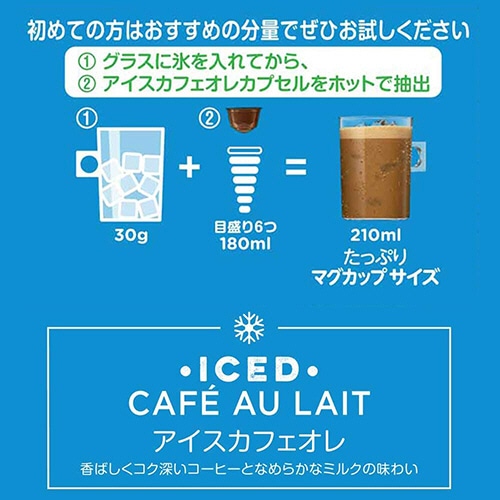 | 商品仕様 | ●種類/アイスカフェオレ ●賞味期限/商品の発送時点で、賞味期限まで残り120日以上の商品をお届けします。 ●その他仕様/●16杯分 ●ミルク入り ●備考/※メーカー都合により、パッケージデザインおよび仕様が変更になる場合がございます。 ●シリーズ名/ドルチェ グスト |