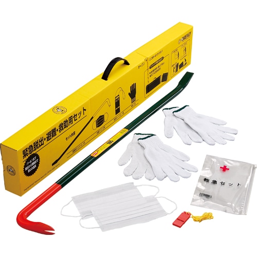 商品仕様 | ●種類/災害救助用備品 ●セット内容/900mmバール1本、軍手2双、防じんマスク2枚、救命ホイッスル1個 ●寸法/W910×D53×H145mm ●重量/約2.7kg |
