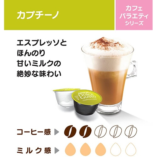 | 商品仕様 | ●種類/カプチーノ ●アソート内容/コーヒー(7.5g)×8個、ミルク(16g)×8個 ●容器/紙、プラスティック ●産地/コーヒー豆:コロンビア、ブラジル他、ミルク:フランス、ポーランド ●製造国/イギリス ●カロリー/81kcal ●成分/1杯あたり:たんぱく質 3.8g、脂質 3.5g、炭水化物 8.8g、ナトリウム 48mg ●賞味期限/商品の発送時点で、賞味期限まで残り120日以上の商品をお届けします。 ●保存方法/低温、乾燥した場所に保管してください。直射日光及び高温の場所は避けてください。 ●注意事項/アレルゲン:大豆、乳を含みます。 ●その他仕様/●原材料:[レギュラーコーヒー(カプセル入り)]コーヒー豆、[乳等を主要原料とする食品(カプセル入り)]全粉乳、砂糖、乳化剤(大豆由来) ●8杯分 ●備考/※メーカー都合により、パッケージデザインおよび仕様が変更になる場合がございます。 ●シリーズ名/ドルチェ グスト |