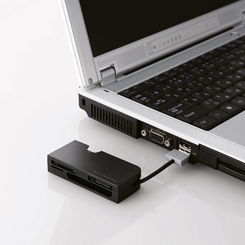 持ち運びや収納に便利なケーブル収納タイプ。コンパクトながら54種類の多彩なメディアに対応したメモリリーダライタ。