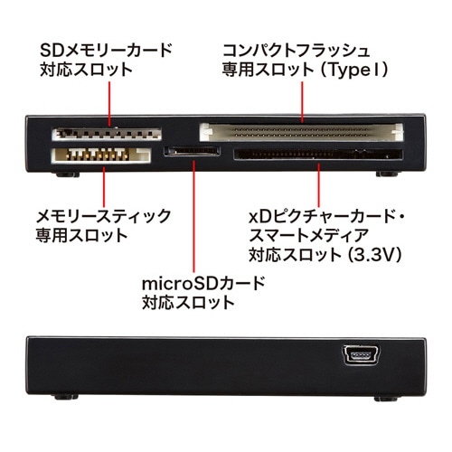 | 商品仕様 | ●寸法/W92.3×D47.3×H13.2mm ●質量/43g ●色/ブラック ●対応メモリー/SDXCメモリーカード、SDHCメモリーカード、SDメモリーカード、miniSDHCカード、microSDXCカード、microSDHCカード、microSDカード、メモリースティック、メモリースティックPRO、メモリースティックDuo、メモリースティックPRO-HG Duo、メモリースティックPRO Duo、メモリースティックセレクト、メモリースティックROM、マルチメディアカード、xDピクチャーカード、スマートメディアカード、コンパクトフラッシュ ●インターフェース/USB Ver.2.0準拠(USB Ver.1.1上位互換) ●ケーブル長さ/約60cm(±10mm) ●対応OS/Windows10/8.1/8/7、Mac OS X 10.1.2~ |