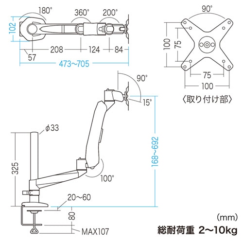 | 商品仕様 | ●重量/3.2kg ●その他仕様/●対応ディスプレイサイズ:24型まで ●耐荷重:2~10kgまで ●材質:本体アーム・ポール/アルミ、ディスプレイ固定プレート/スチール(エポキシ樹脂粉体塗装)、樹脂パーツ/ABS樹脂 ●可動範囲:角度(アングル)/100°、画面上下(チルト)/105°、画面左右(パン)/200°、画面回転(ローテーション)/360°、左右(スウィング)/360°、垂直(バーティカル)/0~270mm ●アーム可動範囲:アーム間接1/左右180°、アーム間接2/360°・垂直(アングル)100°、アーム間接3/左右200° ●対応デスク:eデスク、MEデスク ●付属品:ディスプレイ取付用ネジ×4本(M4×12) ●備考/※想定されるディスプレイサイズは一般的な目安を示しています。取り付けにおいてはディスプレイ重量と耐荷重を基準として選定してください。 |