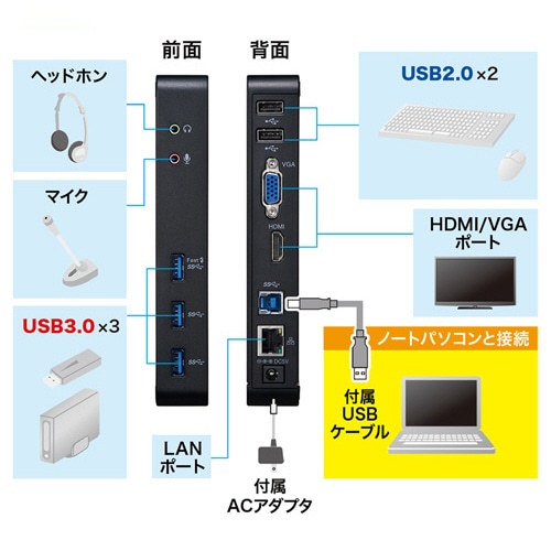USBケーブル1本でHDMI/アナログディスプレイ出力、有線LAN接続、各種USBデバイスの拡張接続が可能