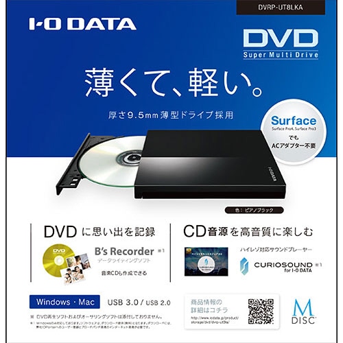 アイオーデータ USB 3.0/2.0対応 バスパワー駆動ポータブルDVDドライブ ピアノブラック DVRP-UT8LKA 1台