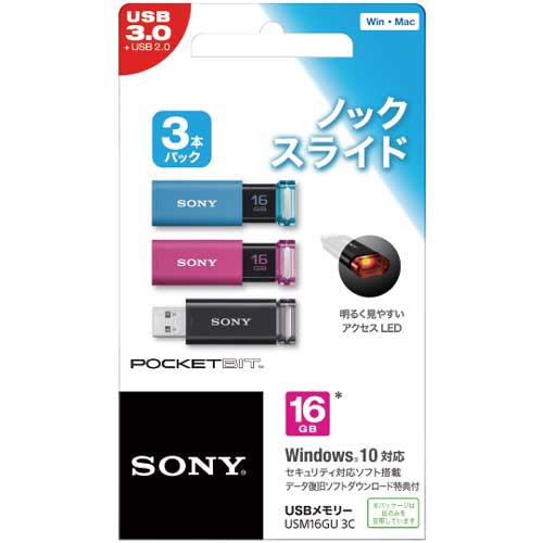 ソニー USBメモリー ポケットビット Uシリーズ カラーミックスパック 16GB ブルー・ピンク・ブラック USM16GU 3C 1セット(3個:各色1個)