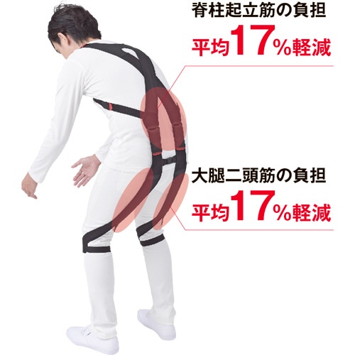 ●前屈作業中の腰を弾性生地の反発力でしっかりサポートする、Mサイズのサポートウェア。脊柱起立筋、大腿二頭筋の負担を平均17%軽減。(株式会社モリタホールディングス技術研究所調べ)