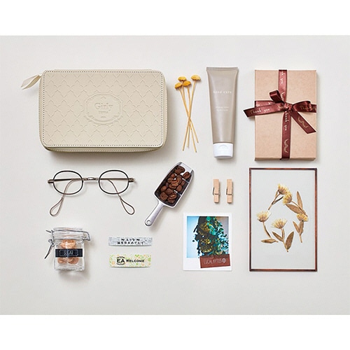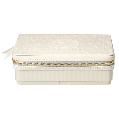 ●縫製カバーと本体が一体化されたコスメポーチのようなデザイン、本体色はクリームの「テプラ」PRO SR-GL2です。手触りや質感にもこだわり、落ち着いた大人の雰囲気を持たせました。