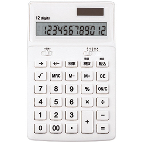 商品仕様 | ●桁数/12桁 ●寸法/W106×D172×H25mm ●質量/約140g ●色/ホワイト ●機能/2電源、オートパワーオフ、小数桁指定、ラウンドスイッチ、早打ち対応、税計算 ●表示部/チルト ●その他仕様/●抗菌 ●保証期間/1年 ●備考/※質量は電池含む |