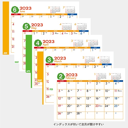 ●優しいタッチの明るい絵柄でメモ欄も広く、インデックスが付いて、めくりやすい卓上カレンダーです。