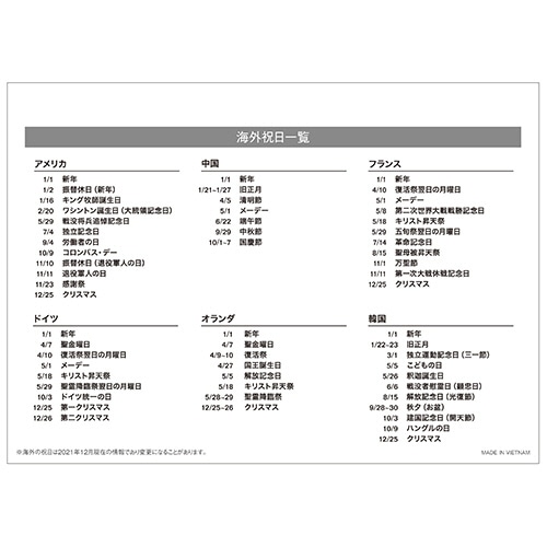 | 商品仕様 | ●タイプ/卓上カレンダー ●寸法/タテ155×ヨコ180mm ●枚数/13枚(表紙共) ●材質/上質紙 ●重量/80g ●その他仕様/●製本:ツインリング製本 ●個装形態:OPP袋包装 ●生産国:ベトナム |