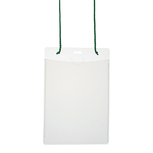 ●はがきサイズの吊り下げ名札、ひも色はグリーンです。