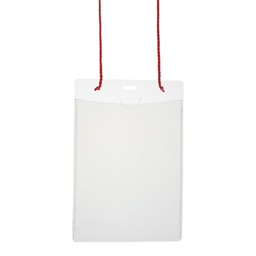 ●はがきサイズの吊り下げ名札、ひも色はレッドです。