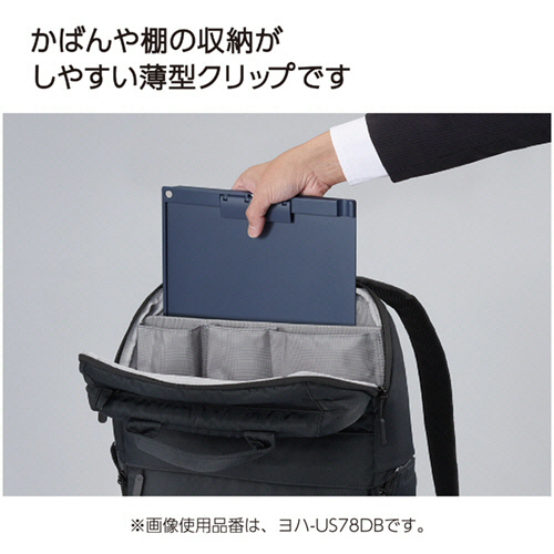 薄型なクリップで棚やカバンへの収納がしやすく、複数枚重ねたときもかさばりにくいです。静かにとじる静音クリップ。