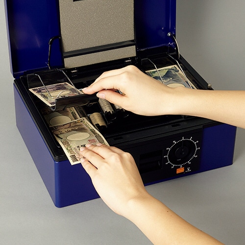 商品仕様 | ●サイズ/B5 ●色/ブルー ●コイン収納枚数/500円(40枚)、100円(50枚)、50円(50枚)、10円(50枚)、5円(50枚) ●施錠方法/シリンダー錠+ダイヤル錠 ●内寸/W271×D189×H68mm ●外寸/W305×D240×H134mm ●重量/3.1kg ●材質/SPCC、ABS ●付属品/鍵2個 ●その他仕様/●2段トレー ●硬貨飛散防止 ●コインカウンター付トレー ●溝付トレー ●ダイヤルロック ●書類押さえ ●フタはね上げ調節 |