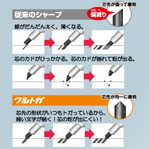 ●クルっと回ってトガった芯をキープ、芯先の形状がいつもトガっているから、細い文字が続きます。また、芯の粉が出にくいです。