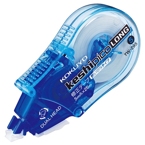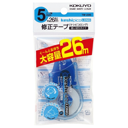 | 商品仕様 | ●タイプ/使い切り ●引き方/タテ引き ●テープサイズ/幅5mm×長さ26m ●色/青 ●材質/本体前後ケース・カバー:R-PS、プーリー・巻き取りコア・ヘッド本体・キャップ:R-POM、テープコア:PS、ヘッド先端:PP、Oリング:NBR、はくりテープ:PET ●重量/24g ●シリーズ名/ケシピコ ●テープの幅/5 |