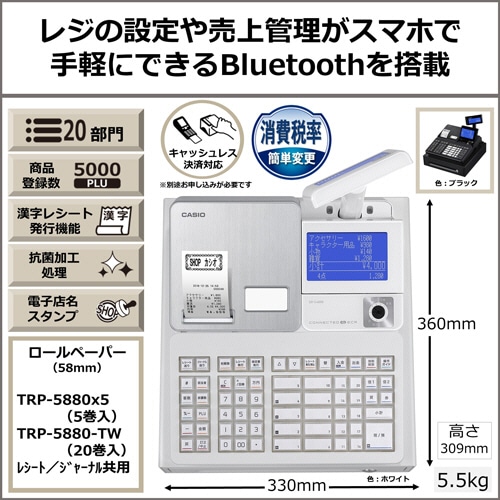 ●機能/キャッシュレス決済対応、Bluetoothでスマホと連携、消費税率簡単変更、適格簡易請求書対応、電子店名スタンプ、漢字レシート発行機能、カシオレジスターツール