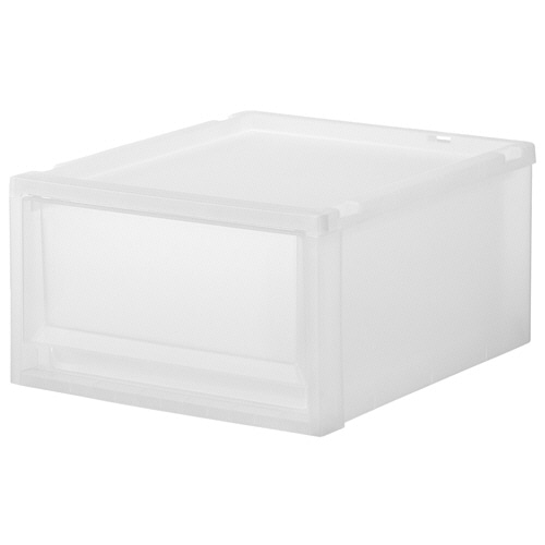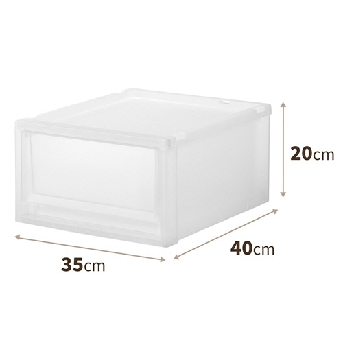 ●幅35cm、高さ20cmのクリアのケースです。スチールラックでの使用やフリーデスクの共通引出にもおすすめです。