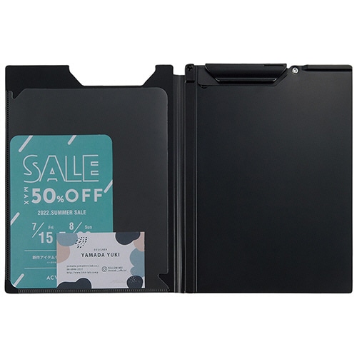 ●ハガキや名刺などが入るポケット付きのA5サイズ対応のクリップファイルです。