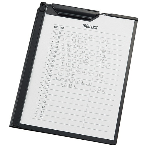 商品仕様 | ●サイズ/A5 ●色/ブラック ●寸法/W222×D169×Hmm ●収容枚数/ノートリーフ20枚 ●材質/オモテ表紙・ポケット・紙押さえ:ポリプロピレン、ウラ表紙(ボード面):ABS樹脂、クリップ:POM ●その他仕様/●ポケット付 |