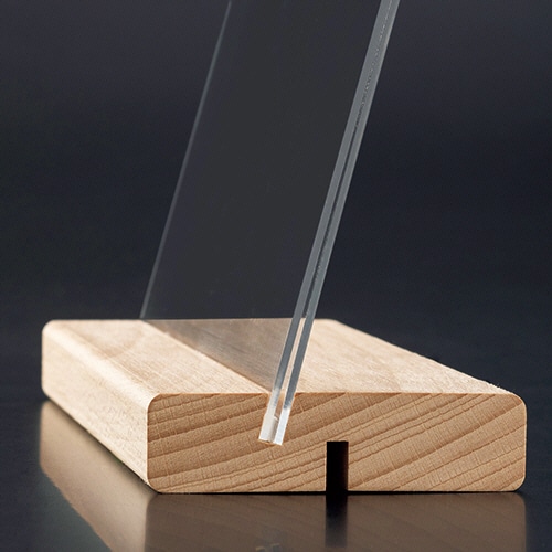 アクリルフレームと天然木製スタンドを組み合わせたサインホルダー。