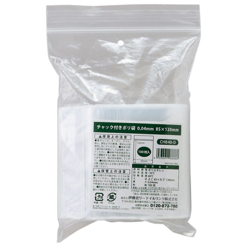 ●厚さ0.04mm、ヨコ85×タテ120mmのチャック付ポリ袋。100枚入です。