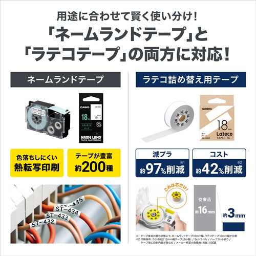 ●テープの種類が豊富なネームランドテープと、カートリッジのプラスチックごみが削減できるラテコテープの両方が使えます。