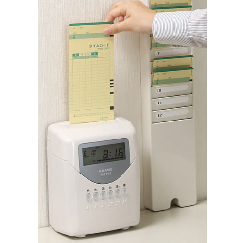 | 商品仕様 | ●寸法/W156×D100×H200mm ●重量/1.4kg ●対応人数/印字のみ:150名、社員計算:60名、パート計算:60人 (※いずれか選択) ●印字欄数/4欄(打刻のみ)、2欄(社員モード/パートモード) ●集計方法/毎日計算、毎月集計 ●機能/特別日ボタン・徹夜ボタン機能、印字欄自動判定、表裏判定機能、パスワード設定、インクリボン残量インジケーター、バックライトのON・OFF機能、出勤人数カウント機能、複数締め日機能、総労働時間数表示機能 ●印字方式/カード自動引込式、ドットプリンター方式 ●印字色/黒 ●メモリー保持/工場出荷時より停電累計時間で3年間(リチウム電池内蔵) ●対応タイムカード/MX・MRXカード(締日共通) ●対応インクリボン/CE-320050 ●電源/AC100V(50/60Hz) ●消費電力/動作時0.2A(6W)、待機時0.1A(2W) |
