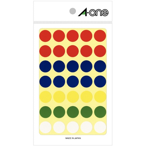 エーワン カラーラベル 丸型 直径15mm アソートタイプ 5色(赤・青・黄・緑・白) 07034 1パック(385片:35片×11シート)