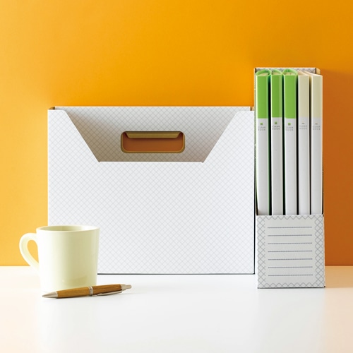 ●シンプルで清潔感のあるホワイト地。A4タテ・グレーのラインデザインのボックスファイル、10冊セットです。