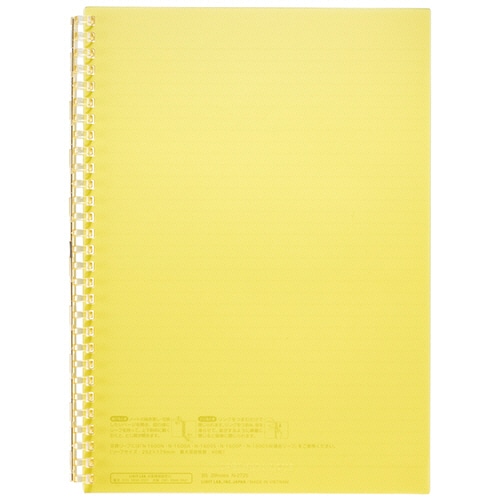 | 商品仕様 | ●サイズ/セミB5タテ ●寸法/タテ252×ヨコ185mm ●罫/B罫 ●罫幅/6mm ●枚数/30枚 ●表紙色/イエロー ●材質/表紙:ポリプロピレン(生地厚0.5mm)、とじ具:ポリカーボネート、リーフ:上質紙 ●その他仕様/●背幅:12mm ●穴数:29穴 ●最大収容枚数:40枚 ●交換リーフ:N-1600N |