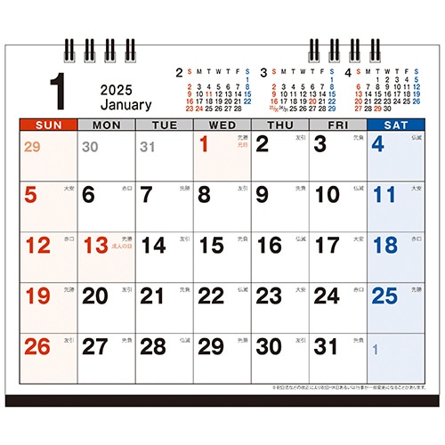 | 商品仕様 | ●タイプ/卓上カレンダー ●寸法/タテ150×ヨコ180mm ●枚数/13枚 ●始まり曜日/日曜 ●表示内容/六曜 ●製本/ツインリング製本 ●材質/マットコート紙 ●重量/90g ●製造国/日本 ●その他仕様/●個装形態:OPP袋包装 |