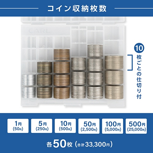 ●6種類の硬貨を10枚ごとの仕切りで各50枚ずつ収納できます。クリアカラーです。