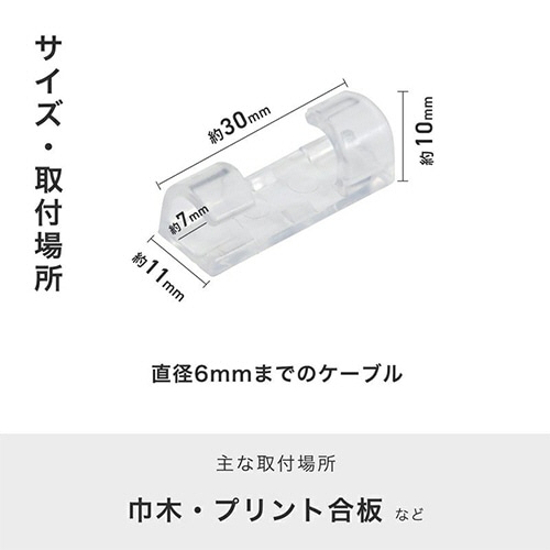 商品仕様 | ●寸法/W30×D10×H11mm ●色/クリア ●材質/ABS樹脂 ●その他仕様/●取り付け可能箇所:巾木・プリント合板(巾木、柱、プリント合板、スチール製品など) ●生産国:中国 ●備考/※寸法は1個あたり。 ※場所によっては、油分やシャンプーなどが付着している場合があります。台所用洗剤を薄めたぬるま湯でよく洗い、よく乾かしてからお取り付けください。 ※一部のプリント合板には粘着テープが付きにくいものがあります。取り付け壁面をお手持ちの消しゴムでこすってからお取り付けください。 |