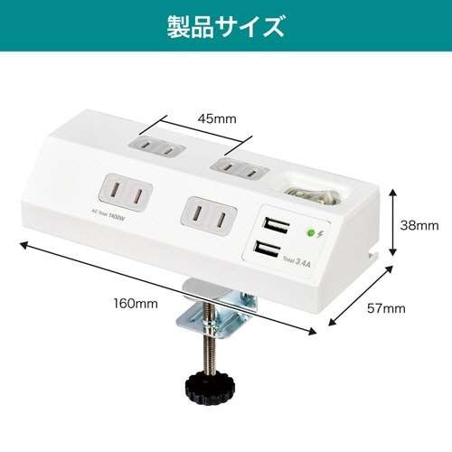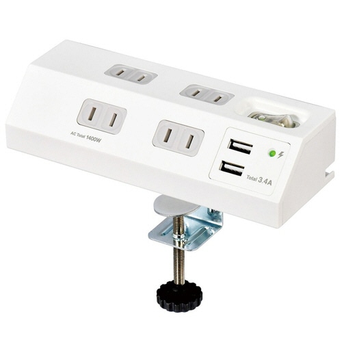 壁際にピッタリ設置可能なUSBポート付AC4個口タップ。取外し可能なクランプ付。