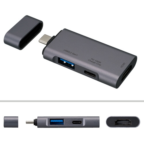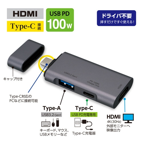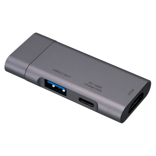 | 商品仕様 | ●寸法/W68×D30×H10mm ●その他仕様/●重量:約25g ●対応機種:Type-C端子を搭載したパソコン、タブレット、スマートフォン ●対応OS:Windows 11/10、macOS 10.15以降、ChromeOS、iPadOS 16以降、iOS 17以降 ●コネクタ形状:PC側/USB Type-Cオス、接続機器側/USB Aメス×1・Type-Cメス×1(PD充電専用)・HDMI(タイプA 19ピン)メス×1 ●インターフェース:USB3.2Gen1(3.1Gen1/3.0) ●電圧/最大供給電流:5V 720mA ●最大転送速度:5Gbps ●PD最大電力:100W ●電源:バスパワー ●HDMI映像出力:最大4K/30Hz(HDCP 1.4) ●保証期間:6ヵ月 ●色:グレー ●備考/※最新のOS対応状況はメーカーHPでご確認ください。 ※PCのType-CポートがPD充電に対応していない場合、本製品を接続してもPD充電できません。 ※本製品のType-Cポートはデータ通信およびAltanative modeに対応していません。 ※全ての機器での動作を保証するものではありません。 |